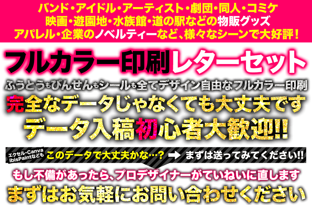業者への注文が初めての方もご安心ください。スマホで作ったデータやフリーソフトで作ったデータでもキレイに印刷できるよう丁寧に修正いたします。難しい事は何も考えずに、どんな形式のデータでもまずはお送りください。仕上がりイメージ画像をご確認いただいてからご注文いただけます。データに自信のない方も、ご安心ください。